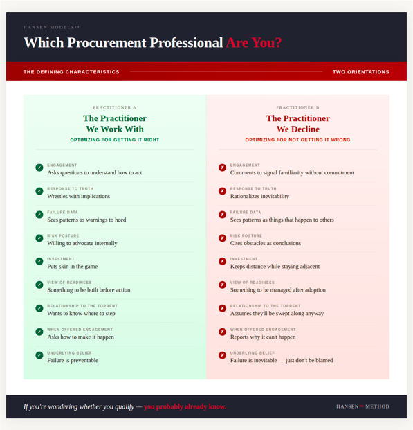 Practitioner B isn’t wrong. They’re navigating real constraints, real politics, real organizational inertia. But the Hansen Method requires something they’re not willing to give: a commitment to clarity before the decision is made.