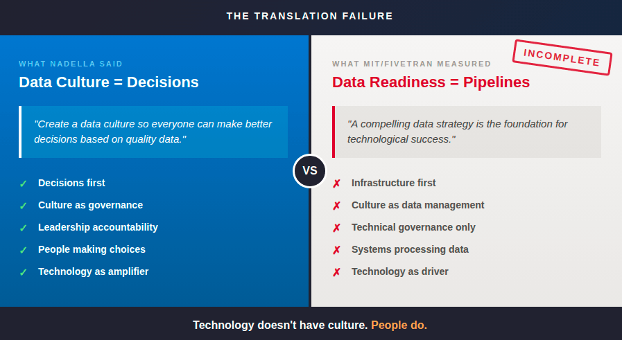 Nadella’s original framing was explicit: culture enables decisions. The word “data” was the modifier, not the subject.