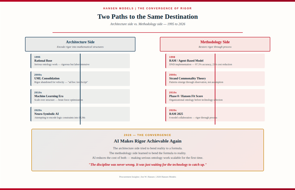 The methodology side — my world — tried to restore rigor through process. Structured collaboration, challenge protocols, convergence requirements, strand commonality surfaced through observation rather than assumption.