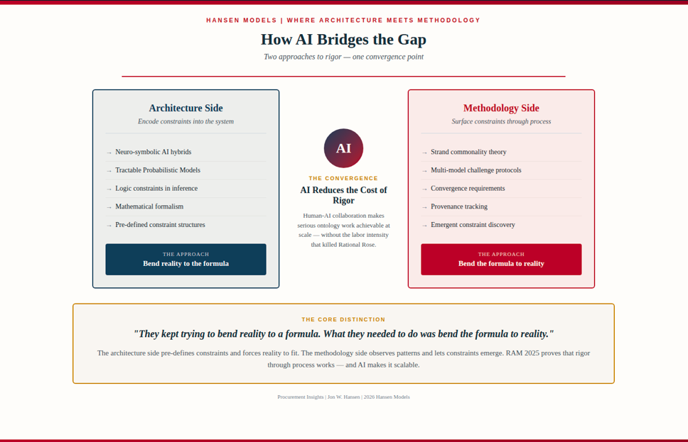 In RAM 2025 — the methodology I’ve built using 6 AI models in structured collaboration — both directions operate simultaneously. The governance layer (convergence requirements, challenge protocols, provenance tracking) enforces rigor. The semantic layer (strand commonality, pattern recognition, emergent constraint discovery) lets reality teach us what the model should be.
