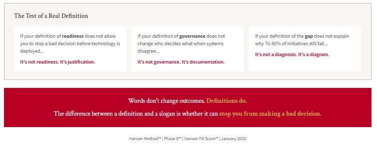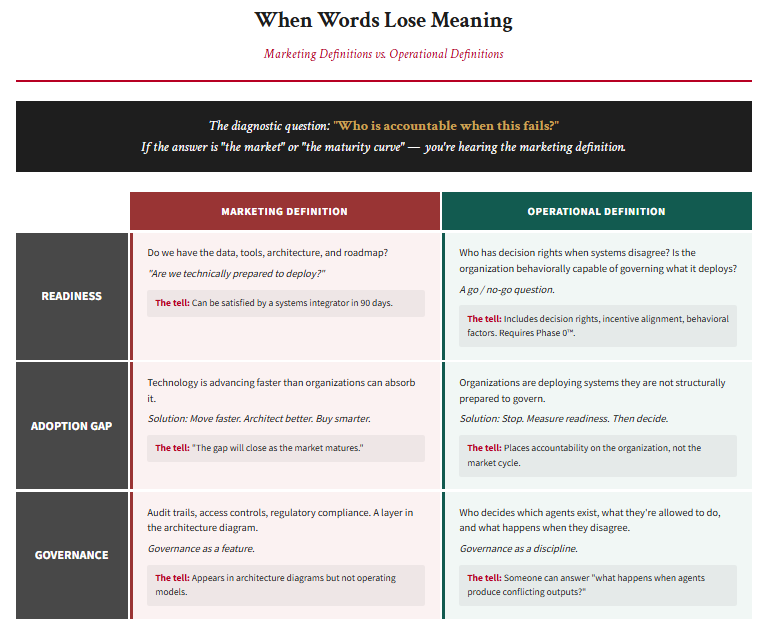 The tell: When a readiness assessment doesn’t include decision rights, incentive alignment, or behavioral factors, it’s using the marketing definition. When it skips Phase 0™, it’s measuring the engine, not the driver.