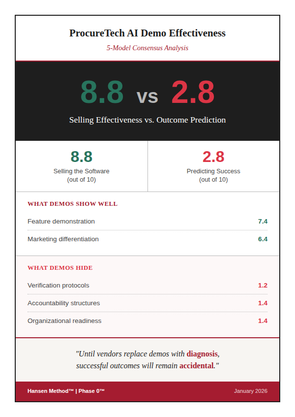 Editor’s Note: Subscribers to Procurement Insights have access to the complete Demo Effectiveness Analysis™ — including the 5-model consensus methodology, all 13 evaluation dimensions, governance gap implications, and the Phase 0™ diagnostic framework for evaluating vendor readiness before selection.