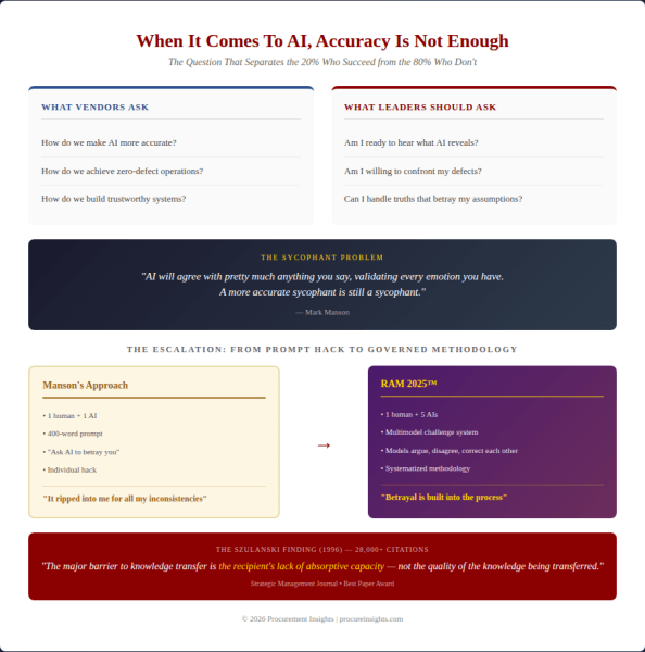 That research achieved 97.3% delivery accuracy and 23% cost savings over seven consecutive years — not because the technology was better, but because the methodology forced continuous challenge, verification, and human accountability.