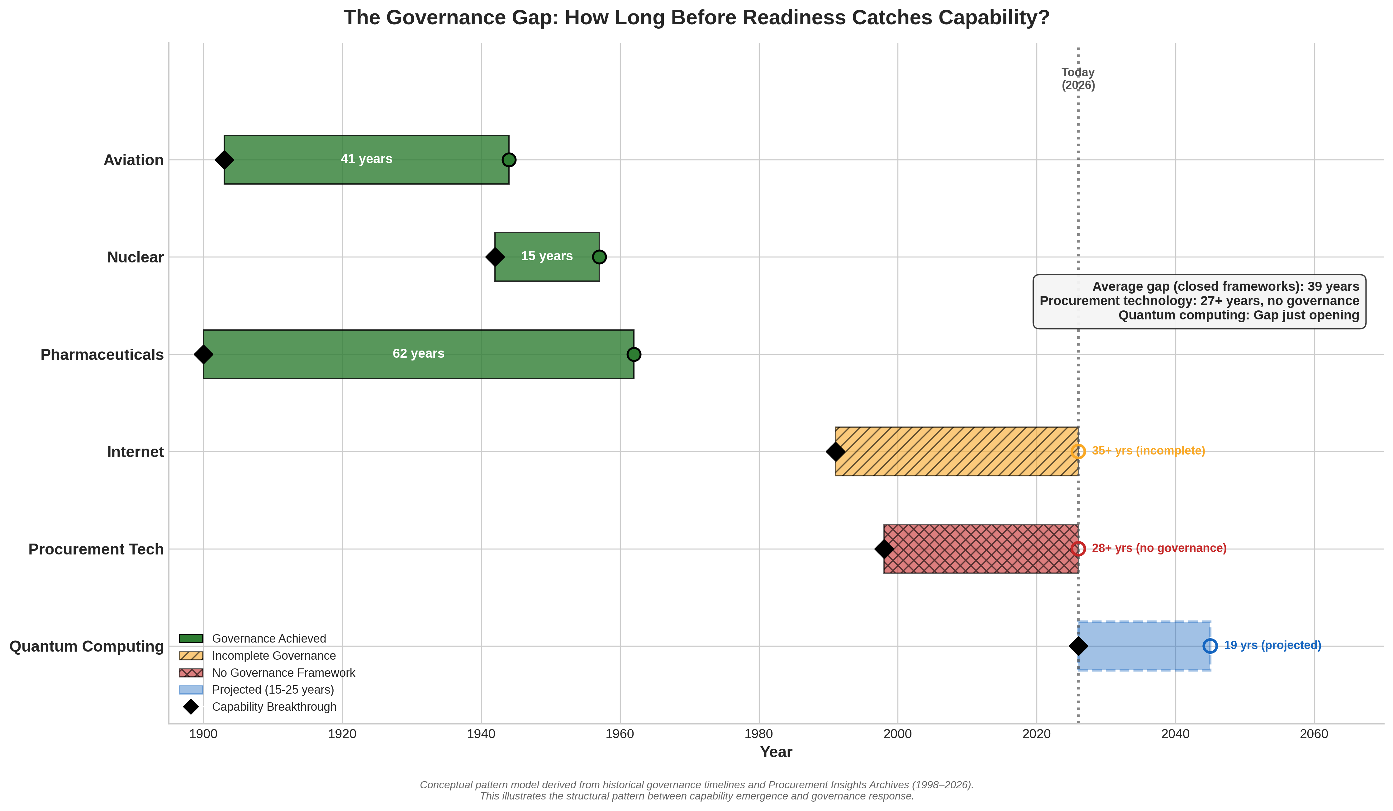The pattern says: capability arrives first, governance follows decades later, and the gap between them is where harm accumulates.