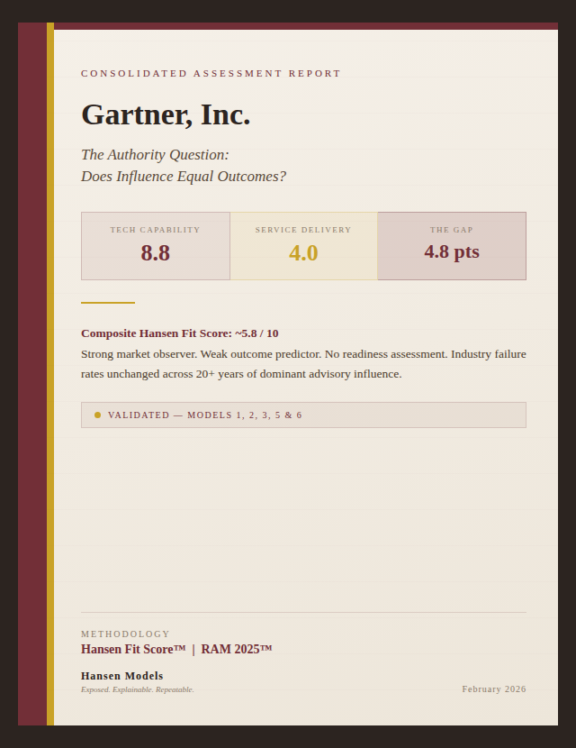 The Gartner Consolidated Assessment Report applies the Hansen Fit Score™ to the world’s largest technology advisory firm — using the same framework we apply to every vendor and advisory firm we assess.