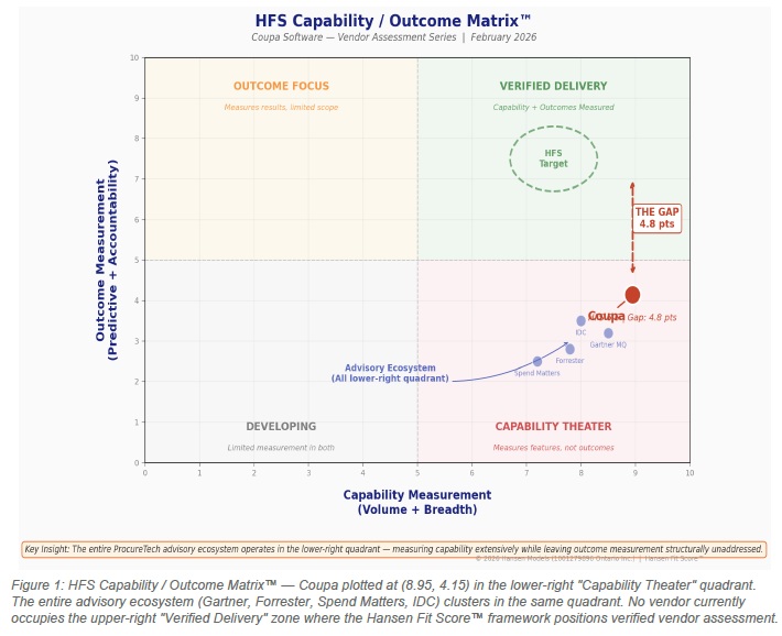 The HFS Capability / Outcome Matrix shows something that no individual analyst report reveals: when you plot Coupa and the firms that evaluate it on the same chart, they all cluster in the lower-right quadrant — high capability measurement, low outcome measurement.
