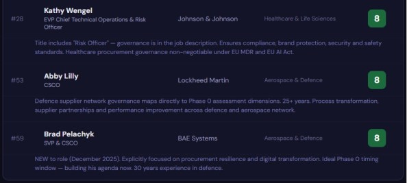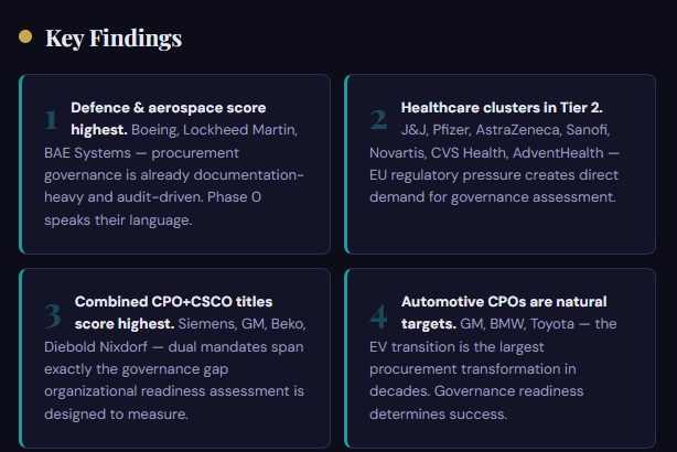 The assessment revealed three patterns that the original ranking cannot surface: which industries create the regulatory and operational pressure that makes readiness assessment urgent, which title structures correlate with governance awareness, and which vocabulary signals in a leader’s profile predict whether they frame supply chain challenges as engineering problems or governance problems.