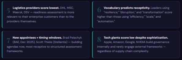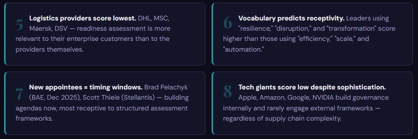 The results were striking. Of the 100 leaders profiled, only 6 scored in the highest receptivity tier. 19 showed strong alignment. The remaining 75 sit in bands where organizational readiness either hasn’t entered the conversation or where structural barriers — internal system-building, logistics-provider positioning, or technology-first orientation — reduce the likelihood of engagement with external governance assessment frameworks.