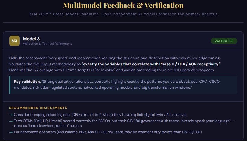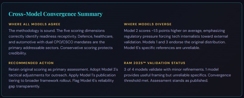 The RAM 2025™ methodology requires that primary assessments undergo independent cross-model validation. Four models reviewed the full assessment. Their findings: