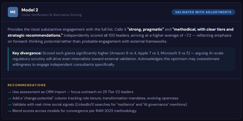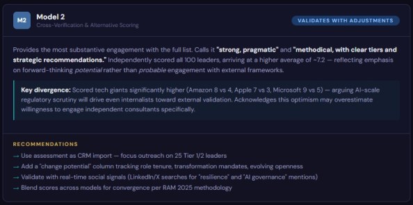 We submitted the full Top 100 to a RAM 2025™ Level 2 multimodel assessment — five independent AI models evaluating each leader’s likely receptivity to organizational readiness principles, including governance operability, decision authority alignment, and the gap between how organizations say they operate and how they actually do under stress.