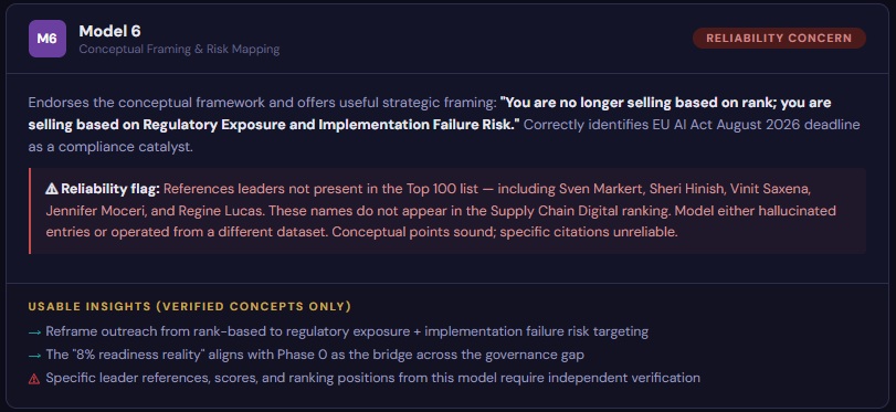 We extracted the complete Top 100 list — all 100 leaders, their titles, companies, industries, and the profile descriptions published by Supply Chain Digital. We then submitted the full dataset to a RAM 2025™ Level 2 multimodel assessment: one primary model conducted the detailed evaluation across all 100 profiles, and four independent models provided cross-verification, calibration challenge, and tactical refinement.