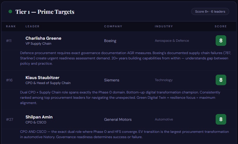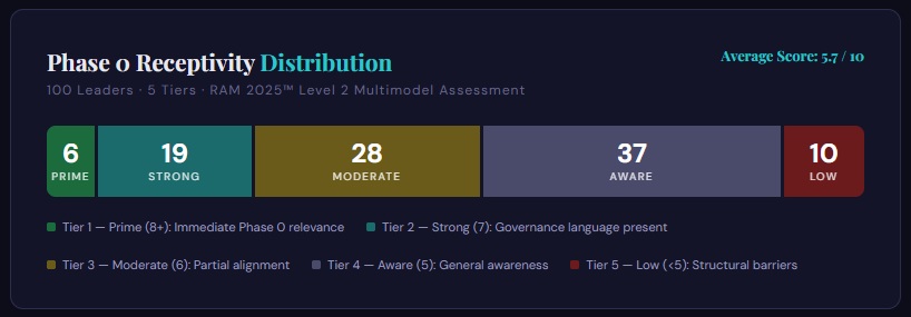 The Phase 0 Receptivity Index is an assessment of leaders’ likely receptivity to organizational readiness frameworks based on publicly available profile information. It is not an assessment of the leaders themselves, their competence, or their organizations’ actual governance maturity. Individual scores reflect alignment with readiness-assessment language and conditions, not personal or professional capability.