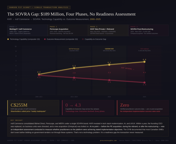 In May 2024, KKR acquired mdf Commerce for C$255 million (~US$189M) and took it private. By August, the company had rebranded as SOVRA — consolidating Bidnet Direct, Periscope, and MERX under a single public procurement brand. By August 2025, the founding CEO had been replaced, six business units had been sold, a new acquisition (Ontopical) had been bolted on, and