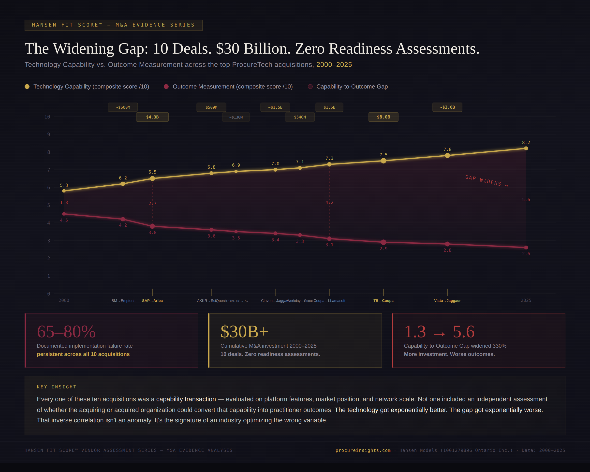 The 10‑deals graphic shows more than $30B invested across acquisitions with the gap widening from roughly 1.3 to 5.6 points, and the SOVRA case shows C$255M spent over four phases with outcomes deteriorating and no verified practitioner success data.