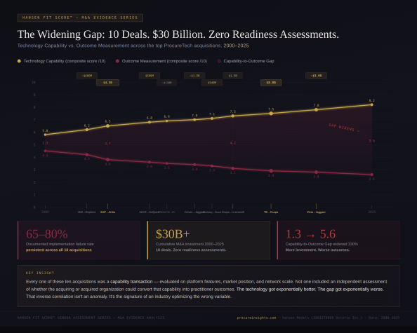 The pattern isn’t vendor-specific. It shows up in SAP’s $4.3 billion Ariba acquisition — which we documented in detail last week. It shows up in Thoma Bravo’s $8 billion Coupa deal. It shows up in every PE-driven consolidation that evaluated technology capability without measuring organizational readiness.