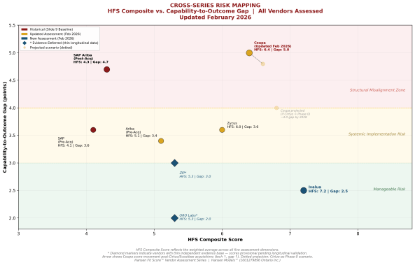 Coupa (HFS 6.4 / Gap 5.0) carries the widest gap in the series — despite having the highest technology capability score (9.2). The Convergence Chart I published alongside the SAP Ariba executive briefing series reveals that this gap existed from inception and was masked by growth momentum. The 2025 acquisitions of Cirtuo and Scoutbee accelerated the pattern. But here’s what makes Coupa’s position interesting rather than simply problematic: Cirtuo’s guided strategy creation workflow is structurally adjacent to Phase 0 organizational readiness assessment. The mechanism for closing the gap may already exist inside Coupa’s own acquisition portfolio. Whether they deploy it that way is the question the next assessment cycle will answer.