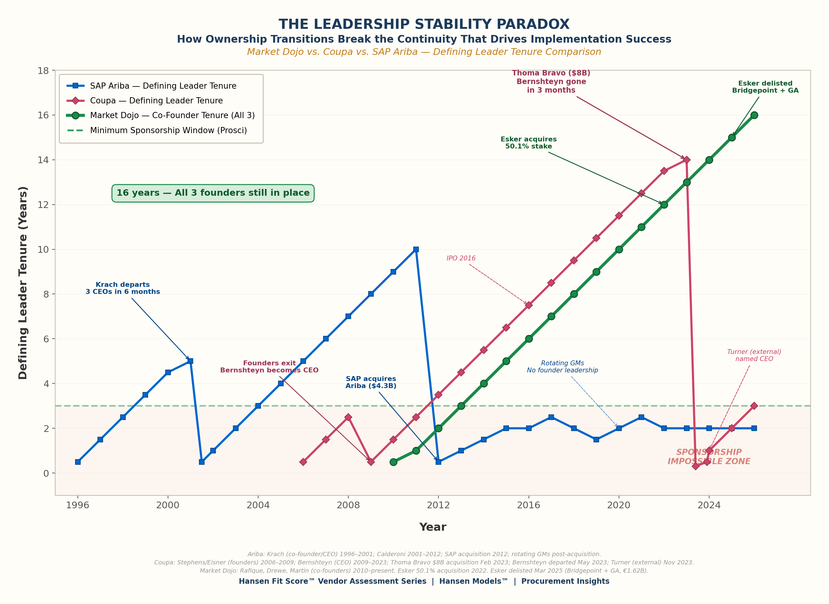 The first chart shows Market Dojo’s stability against JAGGAER and the broader practitioner landscape. This one puts it next to two of the biggest names in procurement technology and asks a simple question: when ownership changes, does the leadership that built the vision survive? At Ariba, it lasted five years. At Coupa, fourteen. At Market Dojo — so far — sixteen and counting.