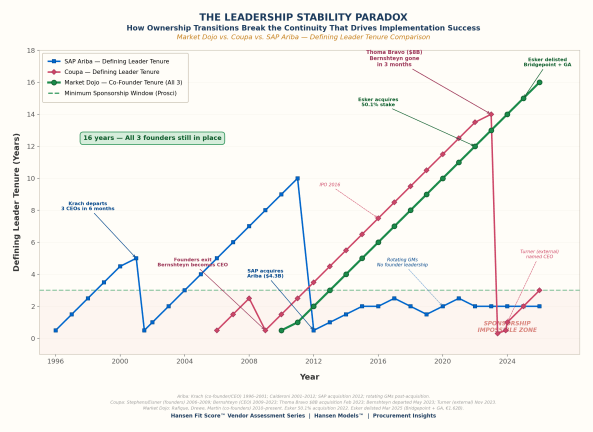 This chart tracks defining leader tenure across three S2C vendors — SAP Ariba, Coupa, and Market Dojo — and the pattern is unmistakable.