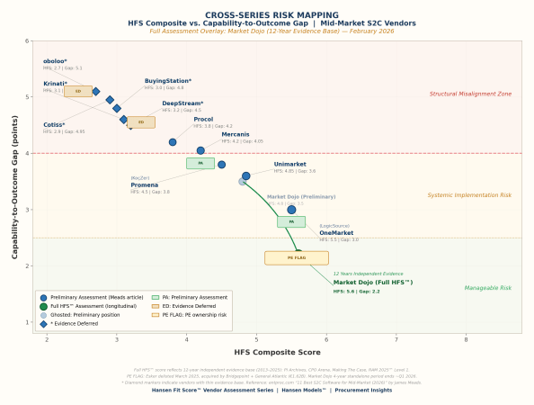 The Hansen Fit Score™ Full Assessment for Market Dojo is the first in a series applying longitudinal evidence overlays to the entproc.com “11 Best Source to Contract Software for Mid-Market (2026)” list. The preliminary Cross-Series Risk Map covering all 11 vendors is available through the Hansen Models™ library.