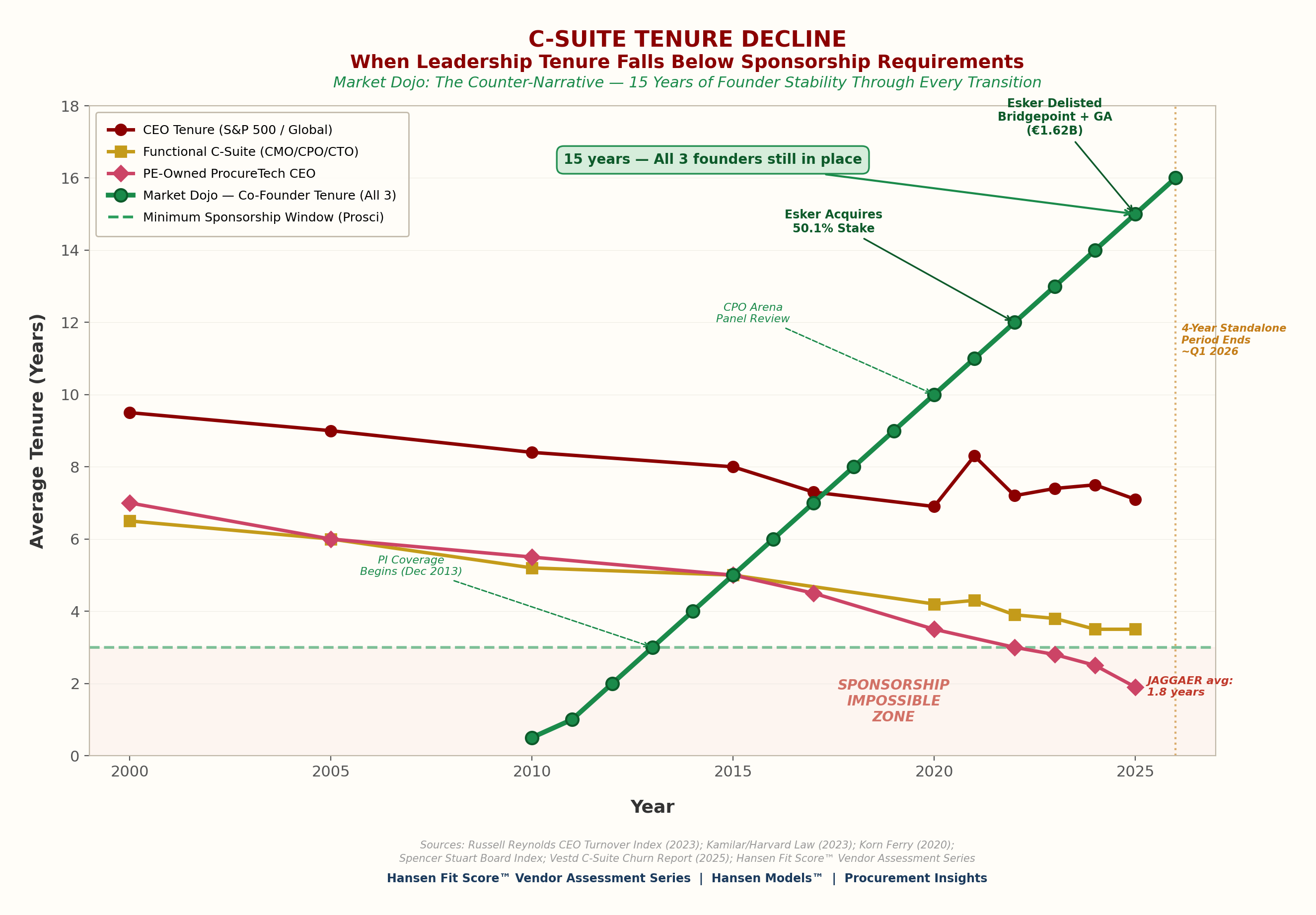 Every line on this chart tells the same story — leadership tenure across the industry is falling. S&P 500 CEO tenure has dropped from 9.5 years in 2000 to 7.1 today. Functional C-suite roles (CMO, CPO, CTO) have fallen below 4 years. And PE-owned ProcureTech CEOs have collapsed to an average of 1.8 years — deep inside what Prosci’s change management research identifies as the Sponsorship Impossible Zone, where leadership doesn’t stay long enough to see an implementation through to outcome.