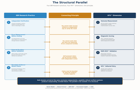 When IBM Research’s quantum verification discipline mirrors a procurement readiness framework — and a former IBM executive is the one who notices — the parallel is worth examining.