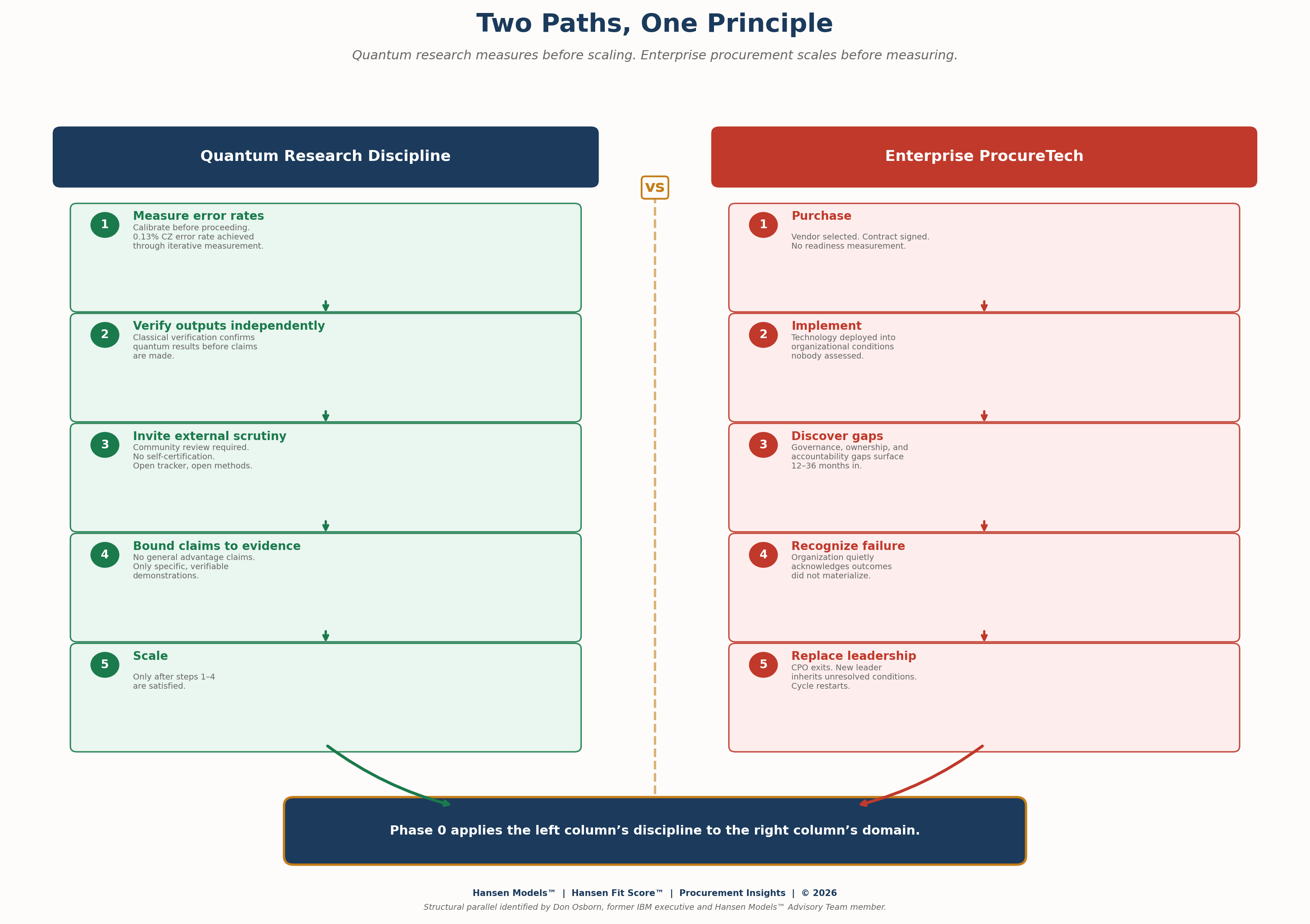 The connection was first identified by Don Osborn, former IBM executive and Hansen Models™ Advisory Team member, who recognized the structural parallel between IBM Research’s quantum verification discipline and the Phase 0 readiness framework. When someone who spent their career inside IBM’s research culture reads a quantum progress update from the Director of IBM Research and immediately sees the same methodology being applied to an entirely different domain — that is not a metaphor. That is pattern recognition from someone who has lived on both sides of the equation.