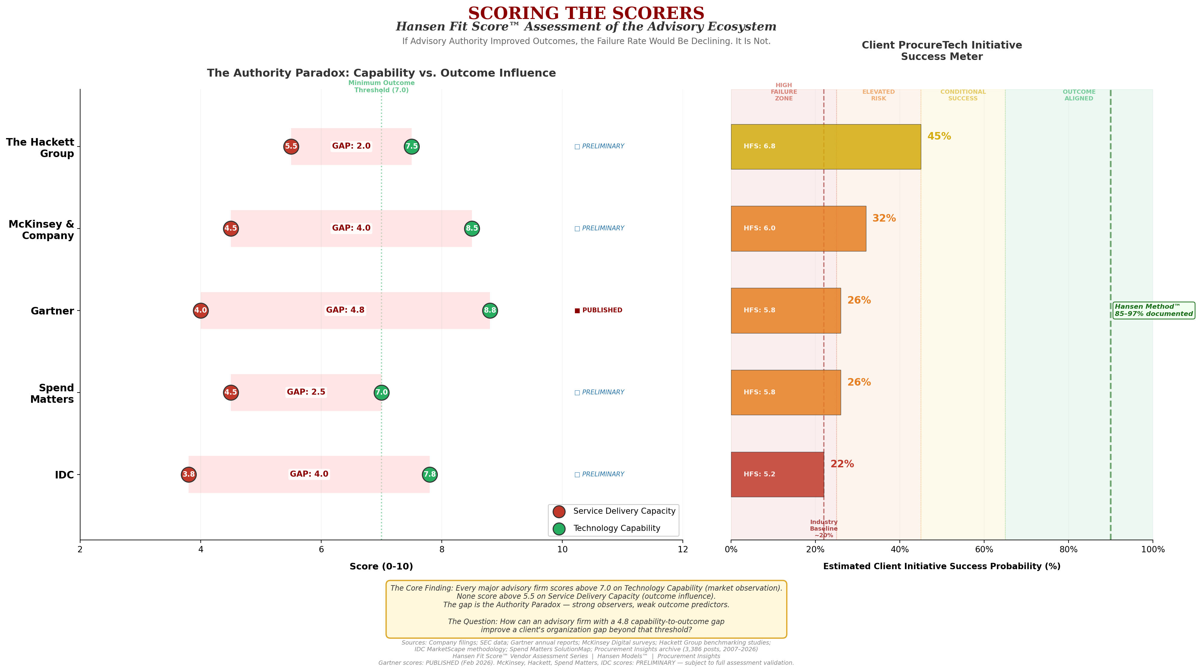 The chart below is the first public visualization of that gap applied to the advisory ecosystem itself — using the same Hansen Fit Score™ methodology we apply to every ProcureTech vendor in our assessment series.