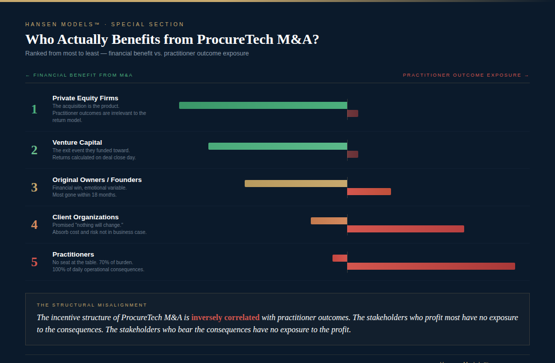 This ranking reveals something that no traditional procurement analysis addresses: the incentive structure of ProcureTech M&A is inversely correlated with practitioner outcomes. The stakeholders who profit most have no exposure to the consequences. The stakeholders who bear the consequences have no exposure to the profit.