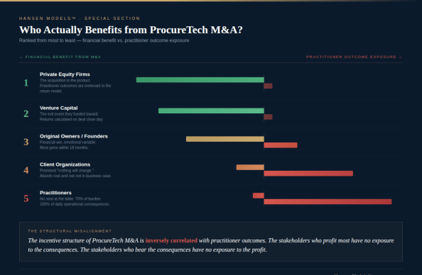 That is not a market failure in the traditional sense. It is a structural feature of how the ProcureTech ecosystem is financed, built, and consolidated. And it explains why no one in the current ecosystem has a natural incentive to measure post-acquisition practitioner impact — because the people who would fund that measurement are the same people whose returns depend on not asking the question.