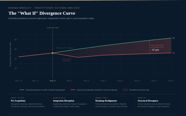 The graphic below illustrates something the industry has never measured: the estimated divergence between the practitioner outcome trajectory under an independent vendor versus the actual trajectory post-acquisition.