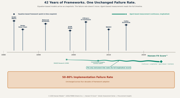 In 1983, Peter Kraljic described a procurement world defined by volatility, independent actors, and patterns that could be “upset virtually overnight.” Then he gave the industry a static 2×2 matrix. The diagnosis was agent-based. The instrument was equation-based. Every major framework since — Porter, O’Brien, RAQSCI, Cullen — made the same category error: acknowledged complexity, then delivered a portable tool that assumes stability. Four decades later, the failure rate is still 50–80%. The frameworks are not failing because they are invisible. They are failing because they are equation-based models applied to agent-based problems. The Hansen Fit Score™ is designed to do what Kraljic’s own observation called for: monitor the agents continuously, read the full longitudinal record, and submit every prediction to public, falsifiable accountability. Kraljic saw the world we model. We have built the longitudinal instrument that his diagnosis deserved.