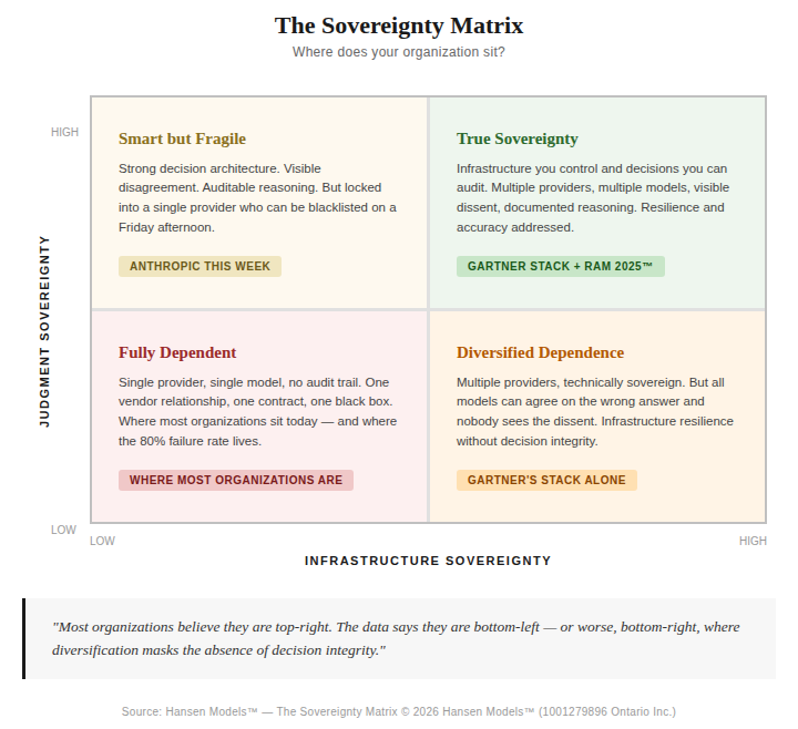This matters to you personally — not abstractly. When a Gartner-backed vendor selection still blows up, when a board asks how a $4 million transformation produced 40% of what was promised, when a regulator wants to see the decision trail behind your AI-assisted procurement strategy — “we followed the Magic Quadrant” is not a defensible answer. Judgment sovereignty is what gives you an auditable rationale: here is what five independent models concluded, here is where they disagreed, here is why we weighted one assessment over another, and here is the documented reasoning behind the decision we made.
