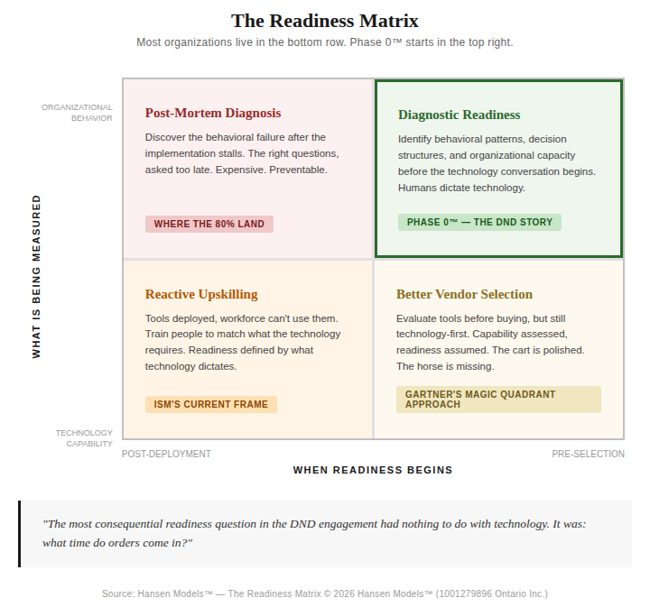 That’s the difference between reactive readiness and diagnostic readiness. ISM is measuring the gap between the workforce and the technology. Phase 0™ measures whether the organization should be walking in that direction at all.