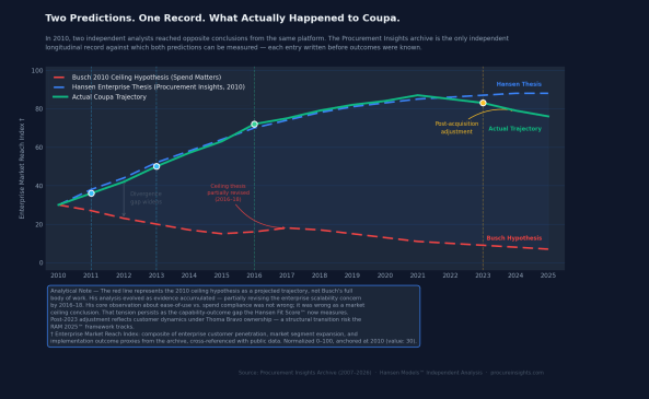 These are not rhetorical questions. They are researchable questions — because the archive exists to answer them. And Coupa is only the opening example. The same analytical model applies to SAP Ariba, JAGGAER, Ivalua, and every vendor in the assessment series. Each becomes the same test: prediction versus outcome, measured against an unbroken independent record.
