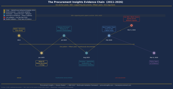 Last night, three Procurement Insights posts surfaced simultaneously as top reads: a 2011 Nokia/Ericsson case study, a post published hours earlier on the Iran war, and a governance framework piece connecting data maturity to implementation failure. No promotion. No algorithm boost. Readers entering through one door were pulled through two more by the connective tissue of the archive itself. This post is about what that means — and why an 18-year longitudinal record of 3,300+ published documents — and counting, because this is a continuous living journal that progressively and perpetually learns and revitalizes insights not before or after events, but as they happen — of which more than 300 posts, papers, and articles directly support this particular evidence chain — is a fundamentally different kind of evidence than anything a commissioned analyst report can produce.