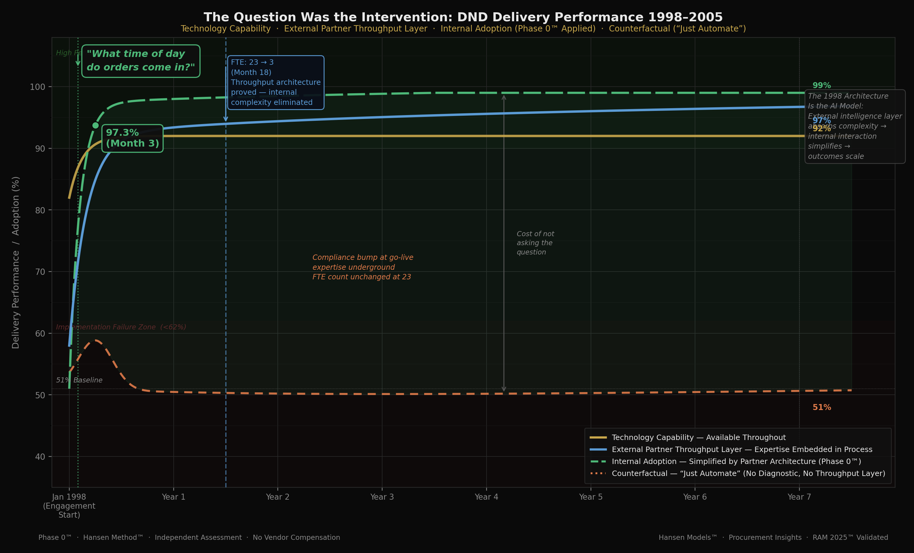 Caption: “The Question Was the Intervention: DND Delivery Performance 1998–2005. Technology Capability · External Partner Throughput Layer · Internal Adoption (Phase 0™ Applied) · Counterfactual (‘Just Automate’).”