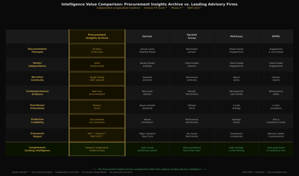 That layered structure — archive as moat, frameworks as methodology, Phase 0™ as applied diagnostic — mirrors how the most durable knowledge-based organizations operate. The competitive advantage is not the deliverable. It is the accumulated institutional memory and pattern recognition that makes the deliverable credible in a way that cannot be replicated by someone who started yesterday. For the CPO or procurement leader evaluating these frameworks: you are not simply buying a methodology. You are accessing eighteen years of documented pattern recognition that no vendor briefing, analyst report, or newly launched platform can manufacture on any timeline.