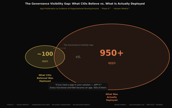 The visibility problem compounds this further. A survey of CIOs on app usage within their own organizations produced a telling result: most CIOs believed there were approximately 100 apps in use. The actual number was more than 950. That gap — between what leadership believes is deployed and what practitioners have actually built around official systems — is the governance gap made measurable. Every shortfall in the sanctioned solution became an app. If you have a gap, APP IT. The result is an organizational technology reality that no single executive, including the CIO, fully sees — and into which agentic AI is now being deployed.