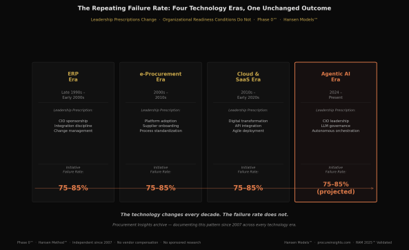I was in those rooms. Forty years in high-technology environments — across mainframe, client-server, ERP, e-procurement, cloud, and now AI — produces a kind of pattern recognition that no single-cycle observer can replicate. What I observed then, and what the Procurement Insights archive has been documenting since 2007, is that the technology ceiling is rarely the constraint. The organizational readiness floor is.