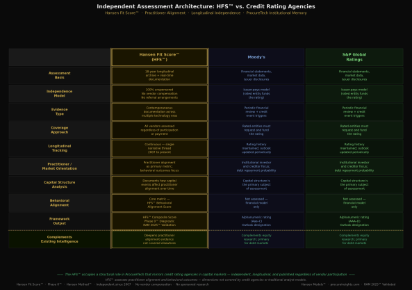 The critical differentiator — and the one that makes the HFS™ model genuinely unprecedented in the ProcureTech industry — is the behavioral alignment dimension. Credit rating agencies assess financial structures. The HFS™ assesses whether a platform’s operational reality matches its practitioner commitments across time, ownership changes, and capital events. That is a measurement no rating agency performs and no analyst firm has the longitudinal independence to produce.