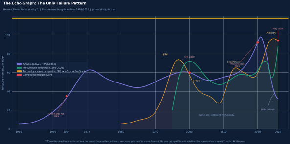 In every case — Y2K, DE&I, and across four consecutive technology eras (ERP, e-Procurement, SaaS/Cloud, and now AI) — the structure was identical: