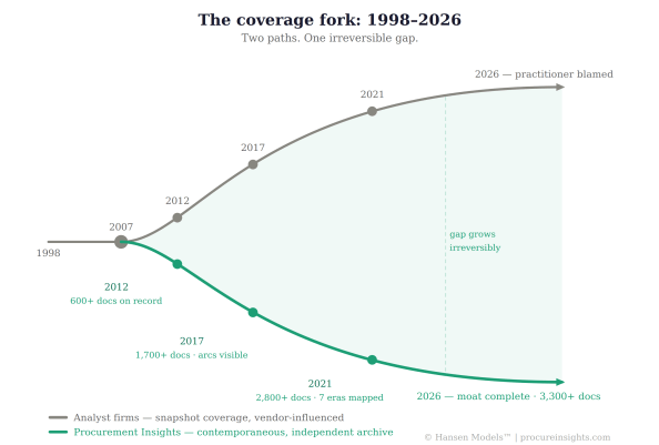 The Procurement Insights archive exists because it was never built for a client. It was built to document what was actually happening — vendor by vendor, implementation by implementation, crisis by crisis — over 18 years and 3,300+ published documents, with minimal vendor sponsorships and no referral revenue.