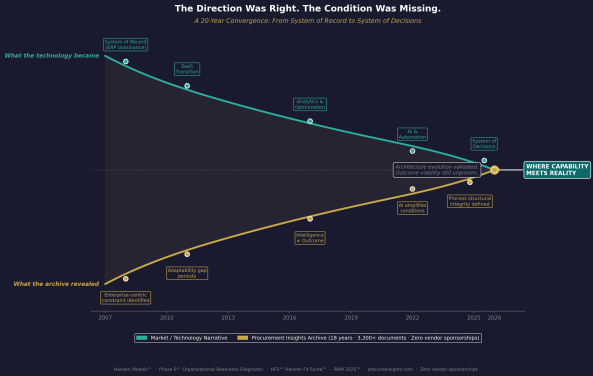 The Procurement Insights archive has been tracking enterprise technology evolution since 2007 — not from a vendor perspective, but from a behavioral one. What the technology became. What the archive revealed. Two lines running in parallel for nearly two decades, converging in 2026 at exactly the point Yemi describes: the moment the architecture is sophisticated enough to function as a system of decisions.