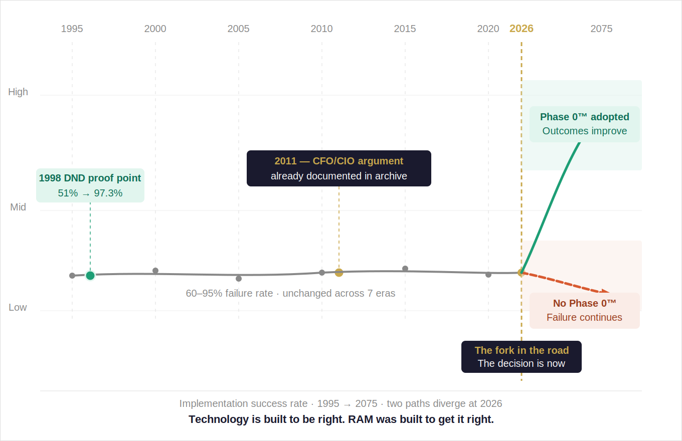 The same 18-year archive. The same zero vendor sponsorships. The same RAM 2025™ multimodel validation framework. The same Phase 0™ organizational readiness diagnostic. The same governing principle that has been consistent since 1998: decisions should be shaped by real-world feedback, not frozen assumptions.