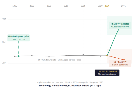 The difference between those two design philosophies is thirty years of failure reports — and the opportunity, right now, for the CIOs and CFOs who commission the diagnostic before the next initiative to be the first ones who do not generate another one.