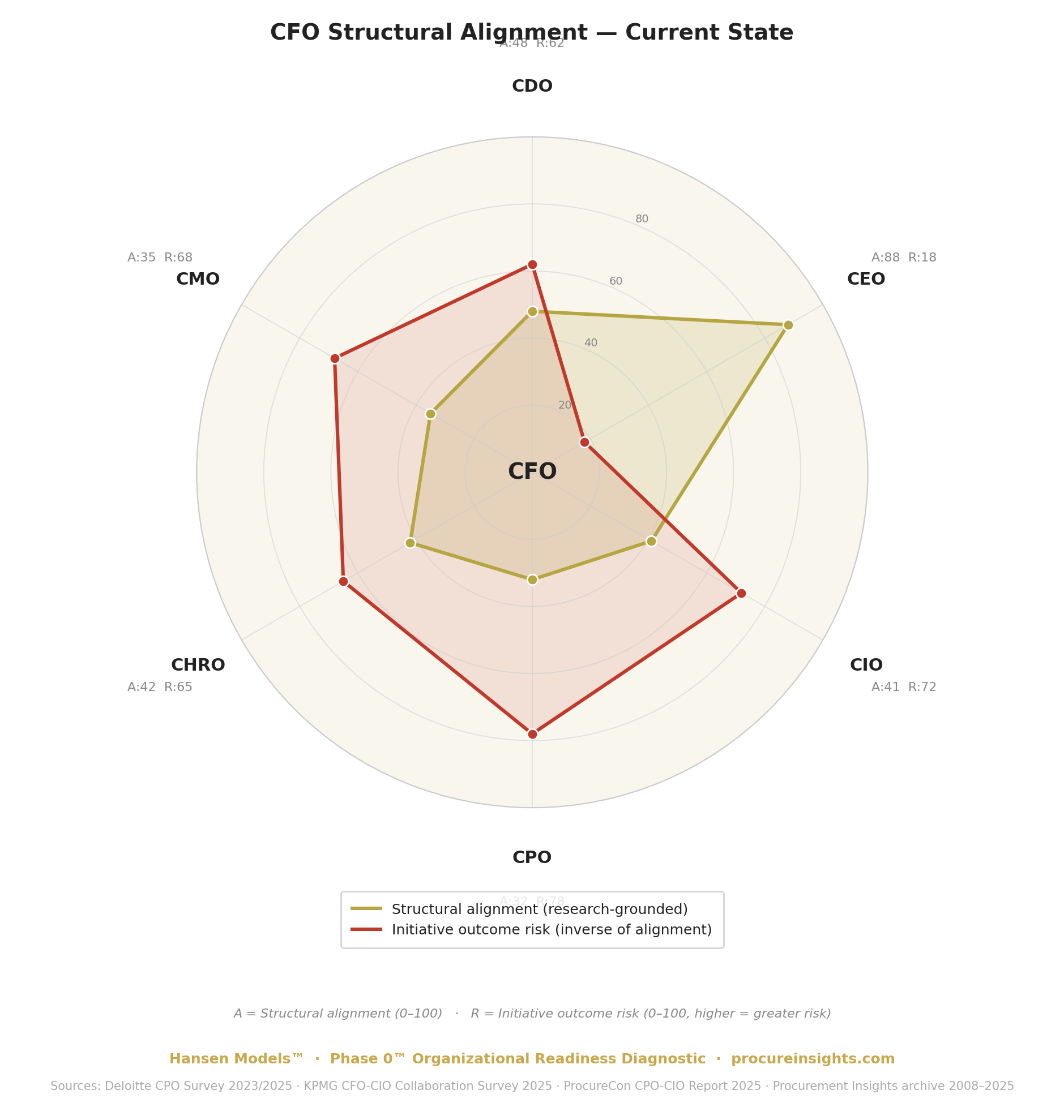 The CPO relationship is the critical exposure. At A:32 and R:78, the CFO-CPO structural alignment is the lowest in the C-suite and the initiative outcome risk is the highest. This is the relationship most directly implicated in procurement technology failure — and the one that receives the least structural attention before initiatives begin. The CPO builds the business case. The CFO approves the capital. The alignment between them, measured against actual initiative outcomes rather than approval intentions, is 32 out of 100.