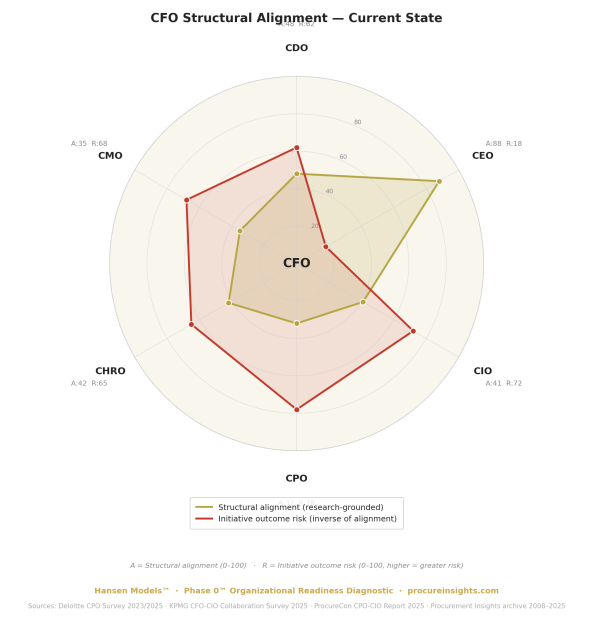 Across 18 years and 3,300+ published documents — zero vendor sponsorships, zero paid analyst relationships — the pattern is consistent: organizations that failed at implementation shared a structural condition that predated the vendor selection. The structural alignment between the CFO and the executive functions responsible for initiative success was low. The initiative outcome risk was high. The procurement function absorbed the post-mortem for a system it did not design and a capital decision it did not control.