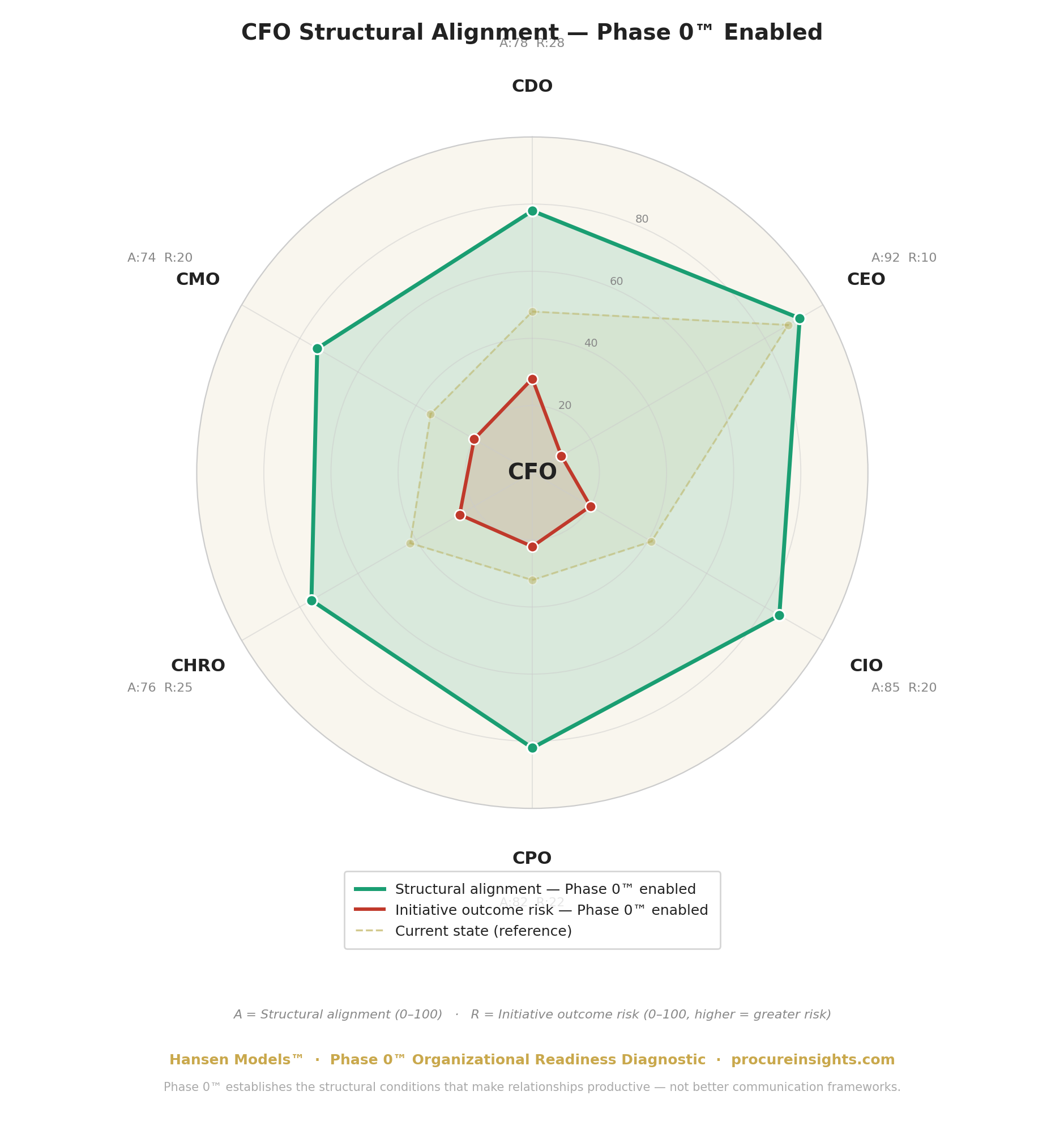 The alignment and risk numbers shift across every axis. The CPO relationship — the highest-risk relationship in the current state — moves from A:32/R:78 to A:82/R:22. Not because the CFO and CPO learned to communicate better. Because the organizational readiness conditions that determine whether their shared initiatives succeed were diagnosed and addressed before the capital was committed.