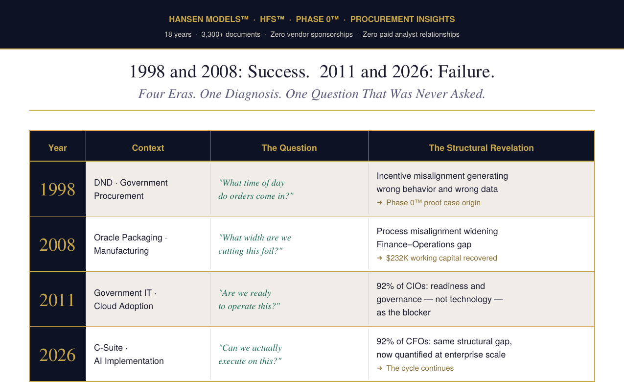 The 1998 DND case is a CIO document. The 2008 Oracle Packaging case is a CFO document. The 2011 cloud hesitation data is a CDO document. The 2026 Coupa AI execution gap is all three simultaneously.