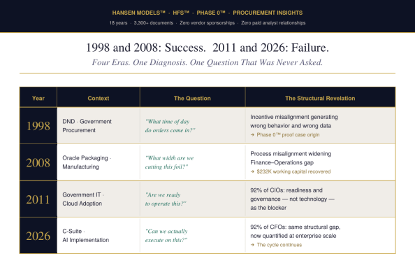 Phase 0™ · HFS™ Hansen Fit Score™ · RAM 2025™ · Hansen Models™ · 18 years · 3,300+ documents · Zero vendor sponsorships · Zero paid analyst relationships · procureinsights.com · hpt@hansenprocurement.com · © 2026 Jon W. Hansen · All Rights Reserved